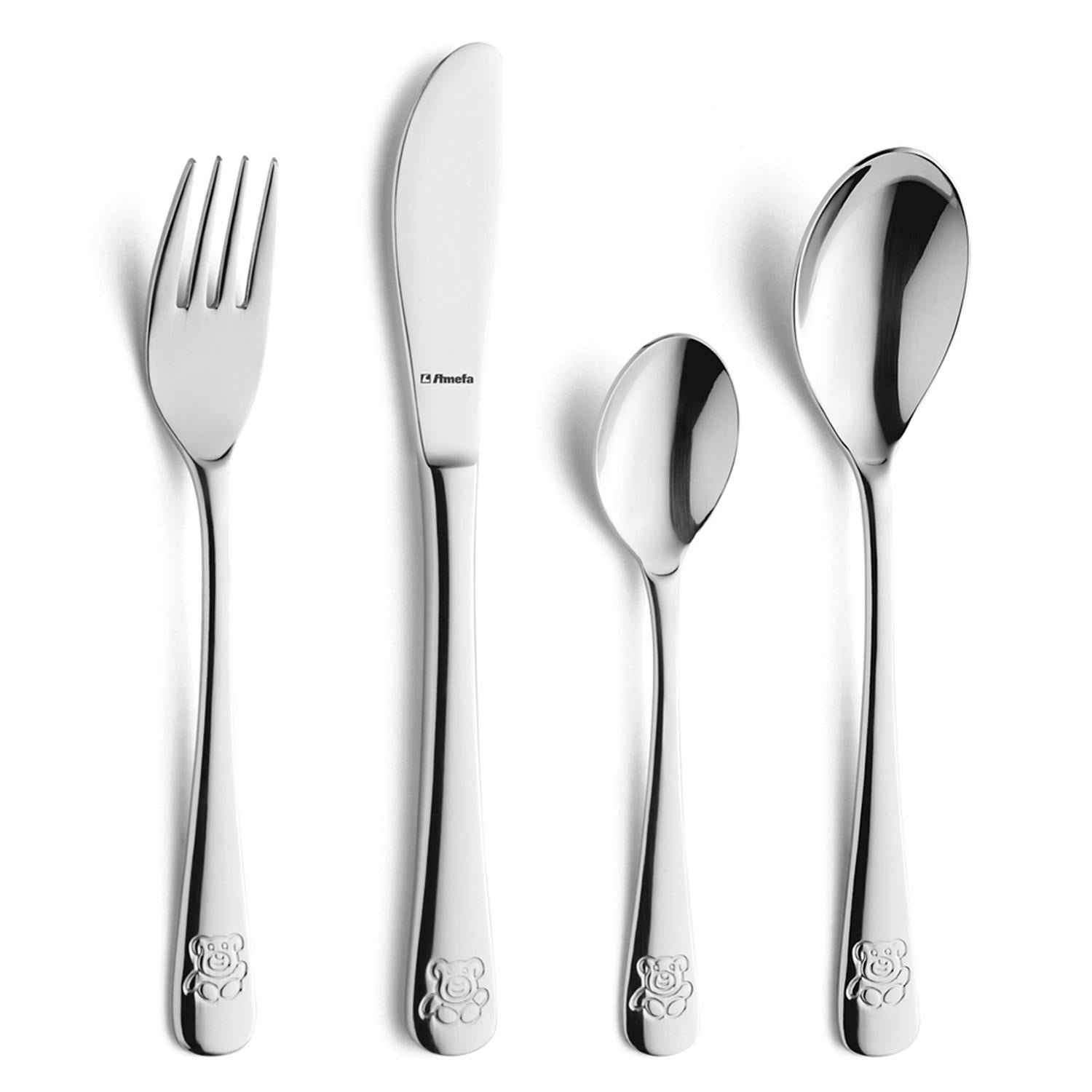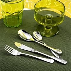 - Ensemble de 4 couverts enfant coordonnés : fourchette, couteau, cuillère de table et cuillère à dessert.