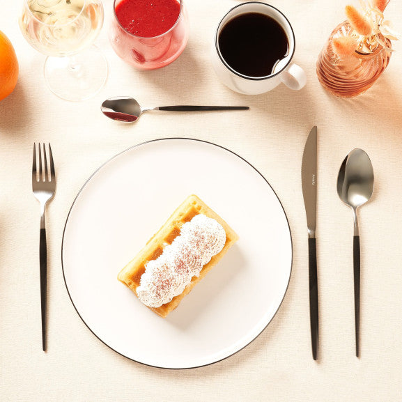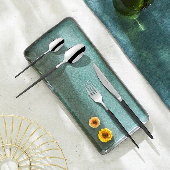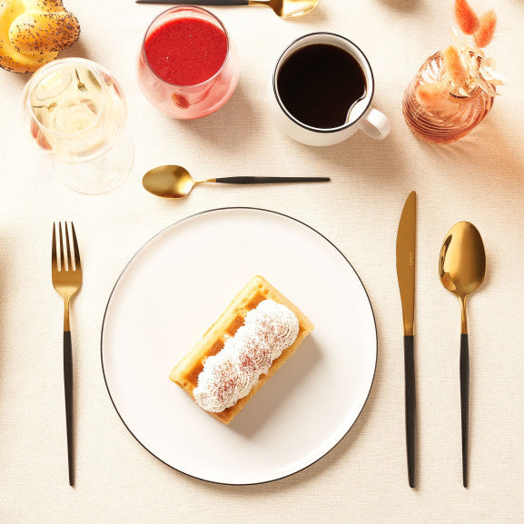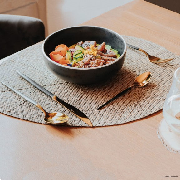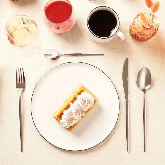 Les couverts sont réalisés en acier inoxydable 18/0, avec une épaisseur de 4 mm, ce qui garantit une bonne résistance à l’usage et une vraie sensation de qualité en main. La version inox miroir affiche une brillance classique et intemporelle, tandis que les finitions PVD cuivre, noir ou or ajoutent une touche de caractère, idéale pour des tables plus affirmées ou des dressages de fête.